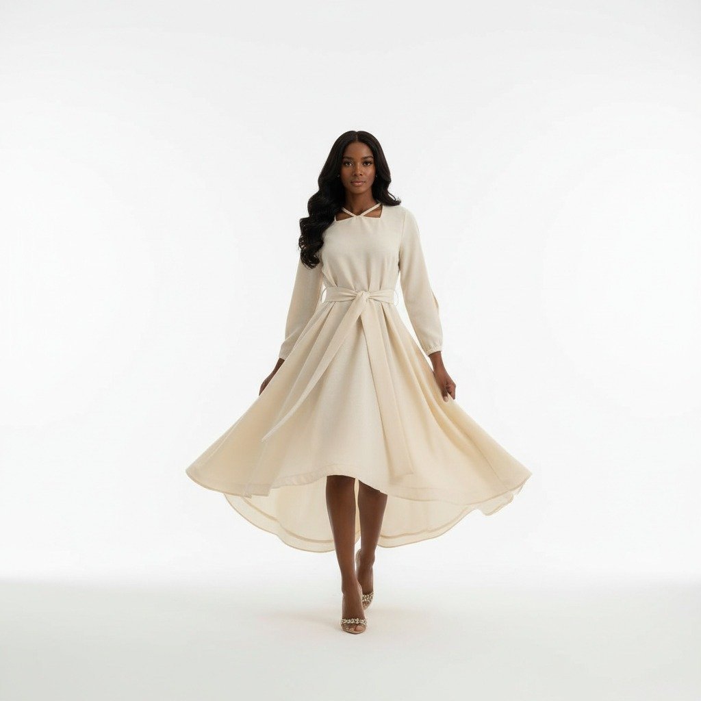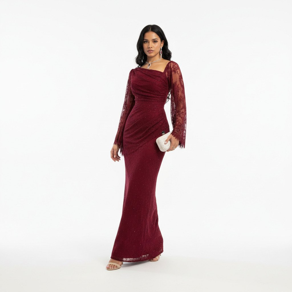 الفستان يفصل الجسم بشكل جميل جدًا، خامته فخمة والتفاصيل أنيقة جدًا، شكراً لكم!